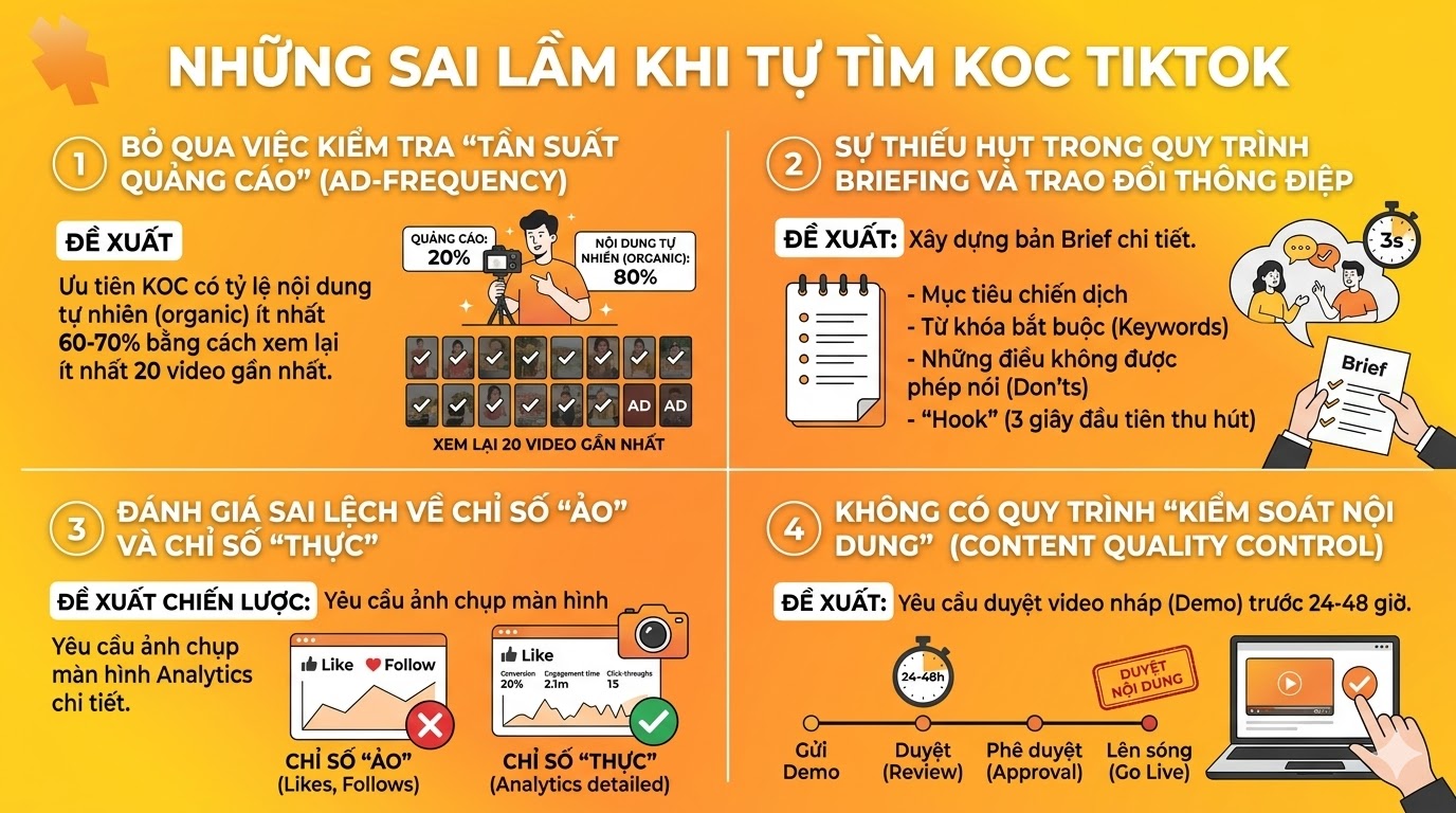 Nhiều doanh nghiệp khi bắt đầu thường lầm tưởng rằng chỉ cần chọn những gương mặt có nhiều lượt theo dõi là đủ. Tuy nhiên, việc tự thực hiện cách tìm KOC trên TikTok mà thiếu đi quy trình sàng lọc và quản trị chuyên nghiệp sẽ dẫn đến những thất bại tốn kém. Dưới đây là phân tích chi tiết về các sai lầm phổ biến và đề xuất giải pháp từ chuyên gia.