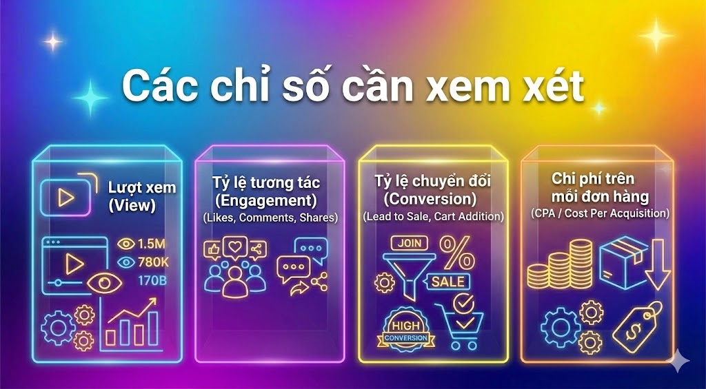 Một chiến dịch booking KOC freecast không thể gọi là thành công nếu thiếu hệ thống đo lường dữ liệu khắt khe. Việc theo dõi sát sao 4 chỉ số sau đây sẽ giúp doanh nghiệp hiểu rõ “điểm gãy” của phễu marketing và đưa ra các quyết định điều chỉnh ngân sách chính xác nhất.